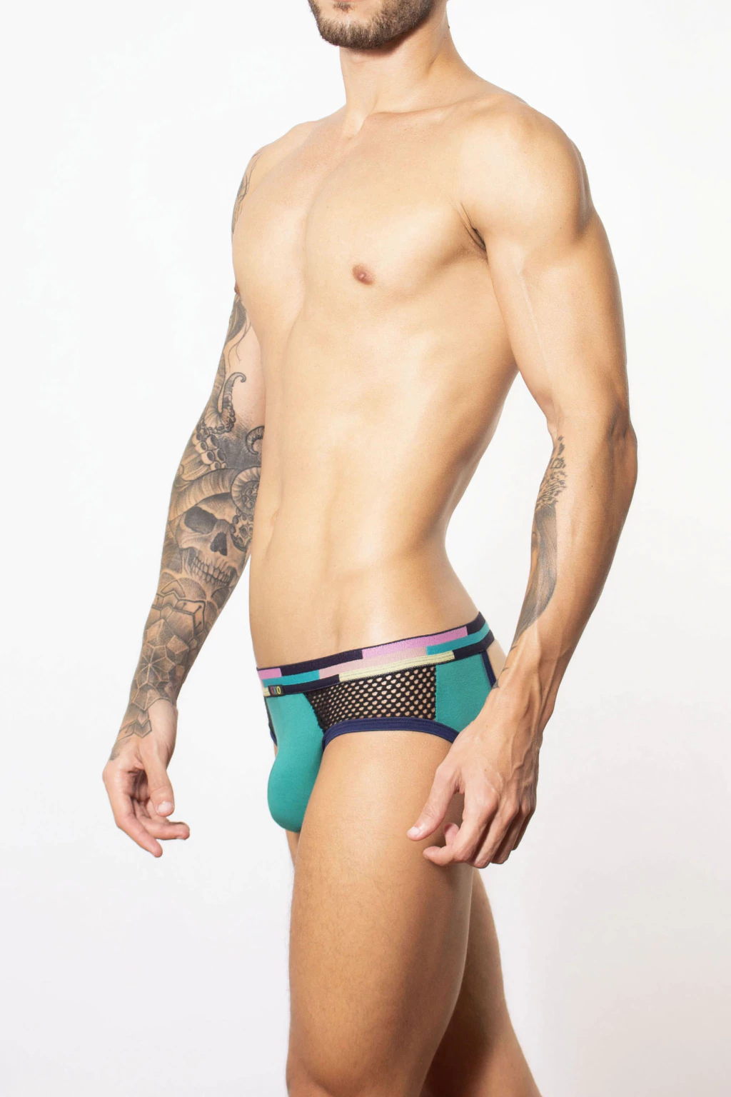 Cueca bottomless ousada em malha de algodão verde, com detalhes em tela preta nas laterais, oferecendo um visual moderno e confortável. Apresenta viés marinho e elástico estampado nas cores verde, marinho, rosa e amarelo, garantindo suporte e estilo vibrante. Composição: 95% Algodão, 5% Elastano. Consulte as medidas detalhadas na última foto para selecionar o tamanho ideal.