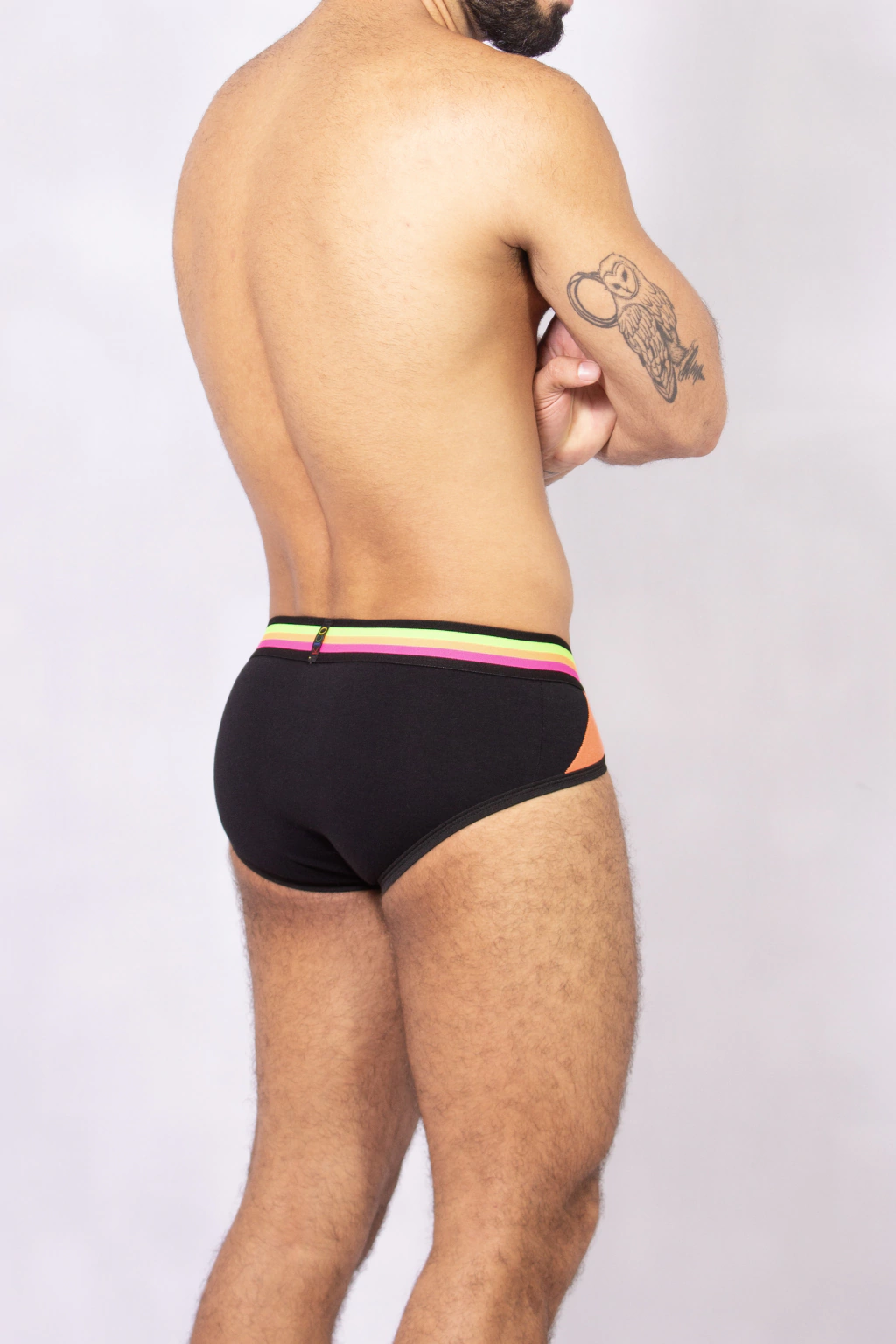 Experimente o conforto e a elegância com nossa cueca slip, confeccionada em malha de algodão. Este modelo apresenta um toque moderno com detalhes vibrantes na lateral em laranja, que se complementam perfeitamente com o viés laranja e preto. O elástico com estampa colorida não só garante um ajuste seguro, mas também adiciona um toque de personalidade à peça.